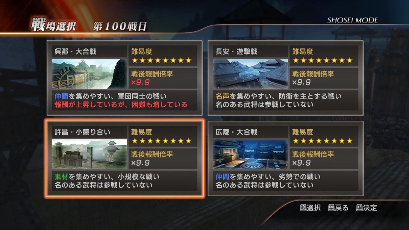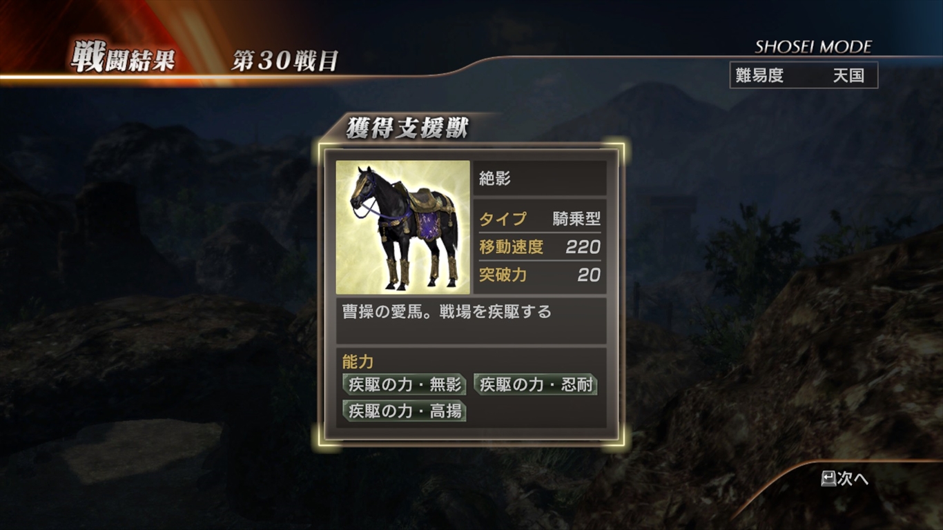 ゲーム 2014/09/23 将星モード100連戦 相変わらず真・三國無双7with猛将伝。 そろそろ赤兎馬が欲しくなってきたので、趙雲が育ってきたのもあり将星モード100連戦に挑戦してみた。 1度目の挑戦は、護衛武将選びや時間配分に失敗して28連戦で止むを得ず帰還。 20戦目以降の敵の硬さにも苦しめられた。 そんな失敗から、護衛武将には兵糧採集を2人と火計を1人配備し、武器に斬撃を乗せて再スタート。 小競り合いを中心にさっさと一戦を終わらせ、時間が足りなくなってきたら遊撃戦を入れて時間を延ばしていく方向でやってみた。 あと、仙桃ドーピングも一応しておいた。 30戦目で絶影。 この辺りはまだ余裕をもって出来る。 問題は50戦を越えた辺りから。 モチベーションが下がるわ、敵の硬さで思うように時間を伸ばせないわで一旦帰っても良くないかと思い始める。 で、遊撃戦で思ったより時間が稼げなかったら戦闘放棄してやり直す戦法に切り替える。 そんなこんなしつつ60戦目勝利で的盧。 ここまできたら後は同じことの繰り返しになるので、然程弱音を吐かずに念願の赤兎も90戦目でゲット。 残り時間も余裕を持って99戦目を終え、いよいよ100戦目へ。 もうさっさと終わらせたいので、最後も当然小競り合いでw やり遂げた。 趙雲もお疲れさま! 途中、遊撃戦で拠点防衛させていた護衛の孫堅が敗走したのはちょっと心残りだけれど、さすがにもう一度やり直したくはないなw 使い道はないけれど、猛像もゲット。 せっかくだから実績埋めたいし。 いやー、きつかった。 別報酬があればやらざるを得ないけど、その必要はないのでもう二度とやらないw オマケ、今日の太史慈。 PR http://appendix.kakuren-bo.com/Entry/5/将星モード100連戦