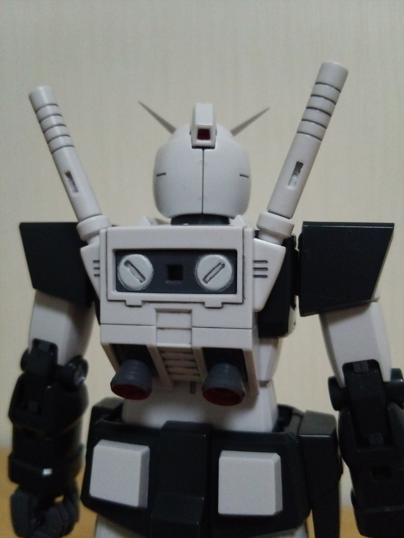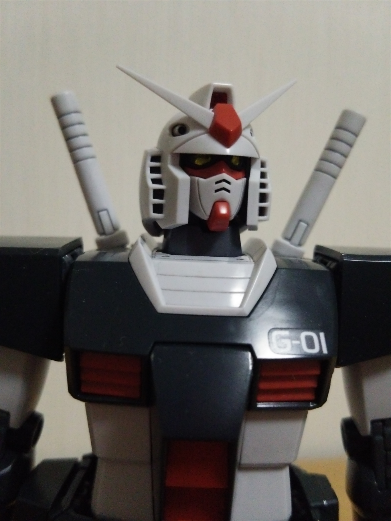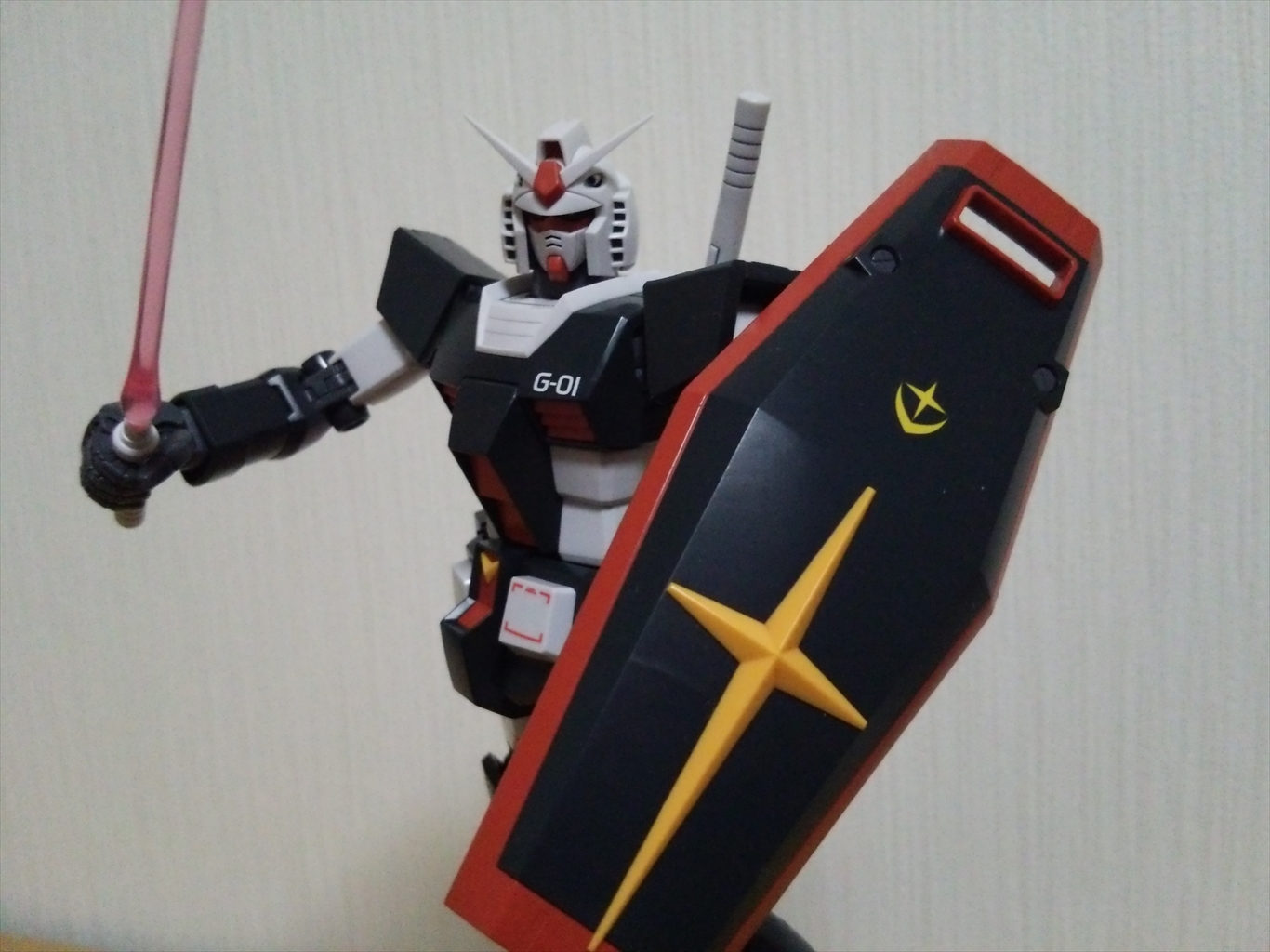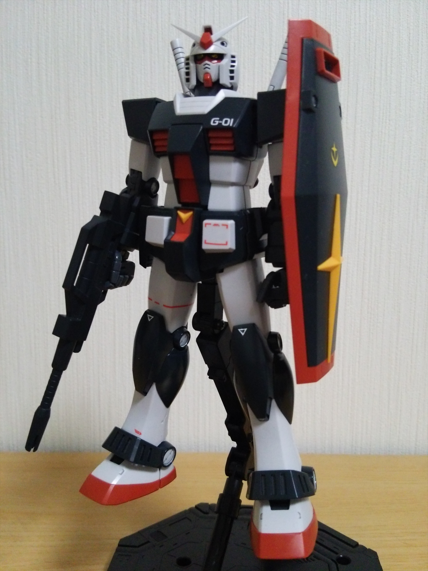 模型 2015/05/31 MGプロトタイプガンダム完成 1年近くかかってようやく完成。 まずはMSV画稿のポーズで。 デカールは画稿と旧1/144キットを参考に。 本当はビームサーベルにも貼る予定がミスして叶わずorz 頭部アップ。 例によってデュアルアイは裏にラピー。 写真より実物の方がもうちょい光拾っているかも。 結局スミ入れはエナメルで割るのが怖く、未塗装部分はラッカーでスミ入れ。 ラッカー塗装した上のみエナメルで。 背部。 全身のスミ入れ箇所自体が少なくオミットしようと思ったけれど、バックパックがスミ入れした方が良いデザインだったので流れで。 一応、バーニア内の赤も塗った。 地味に難所だったシールド裏。 赤そのままは毒々しいしいわ、いざ塗るとなかなか隠蔽出来ないわで面倒だった。 凸凹も多く塗り難くて、あまり近くでは見たくない仕上がり。 そんなシールドとビームライフルを装備。 シールドが重く、ちょっと傾く気が……。 ちょっとだけアクション。 デカール剥げが怖くて気軽に触れない……。 フレーム自体が結構カッチリしているので、動かすにも一苦労。 最後に旧キット展示例風に。 大昔、グレー一色の旧キットを完成させられなかった苦い思い出……。 これで少しは気も晴れたかな。 さて、MSVといえばプレバンでMGジムキャノンの予約が始まっているけど即買いには至らず。 ほぼ同じフレームをもう一度組むのを考えると、ちょいと食指が動かない。 肝心の置き場もないし……。 そんなこんなで本日、MG百式Ver.2.0が着弾。 ……頑張ろう、俺orz PR http://appendix.kakuren-bo.com/Entry/18/MGプロトタイプガンダム完成